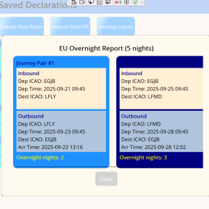 The ‘totalizer’ relies on all journeys being recorded and being symmetrical – that is to say there must be an outbound and return journey whichever jurisdiction one is totalising nights for. Where there are one way journeys erroneous results occur. If for example you have a one way private flight but come back commercial. Where there are not symmetrical ‘pairs’ of journeys the App will ask you if you wish to delete one of the non paired journeys or add another dummy record of the return commercial flight and the symmetry is restored . This can be done for the owner/pilot but also for crew.